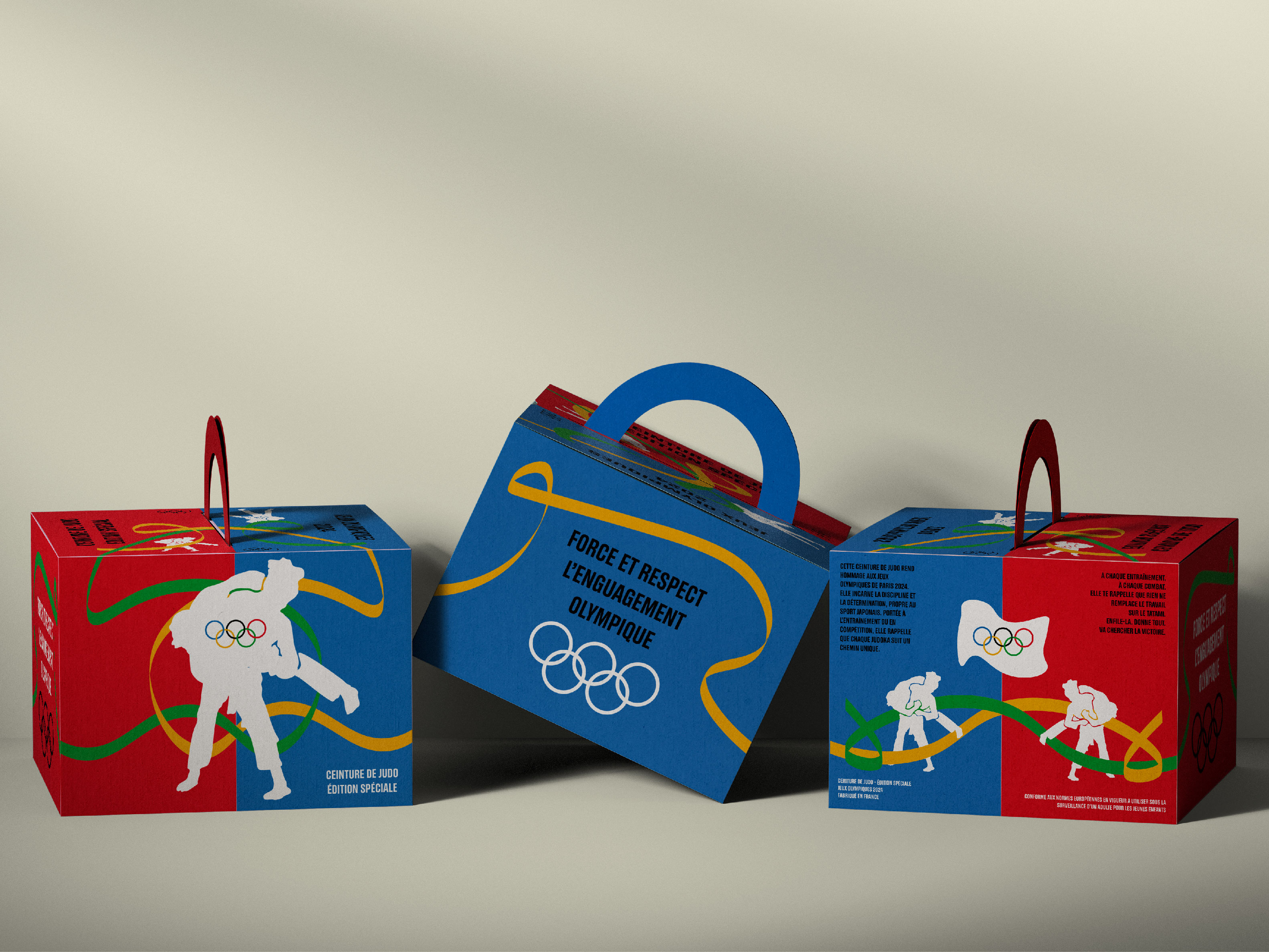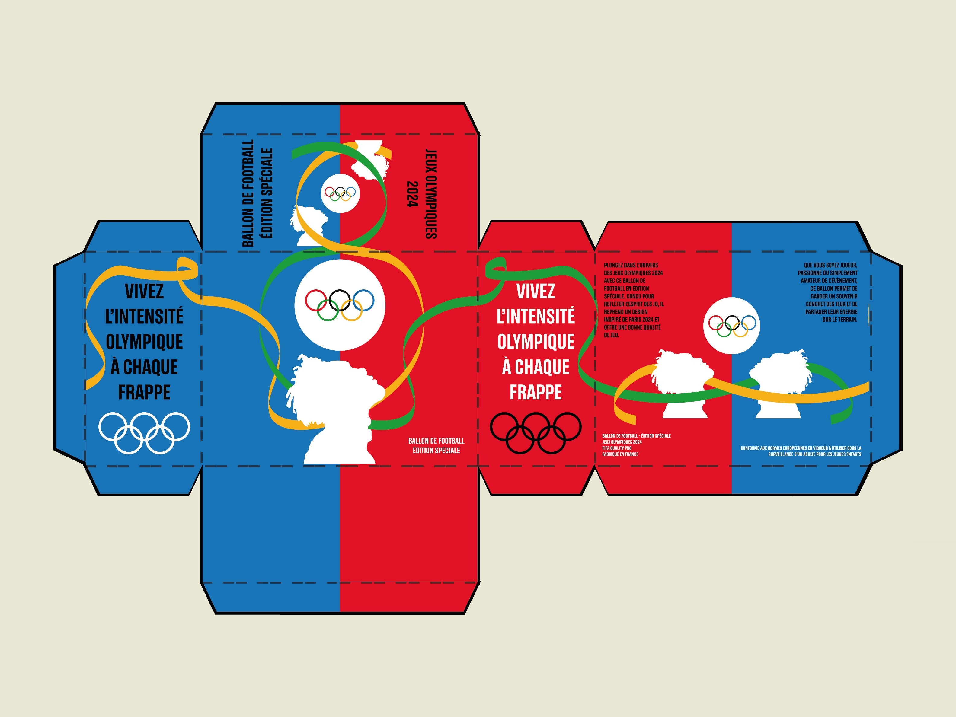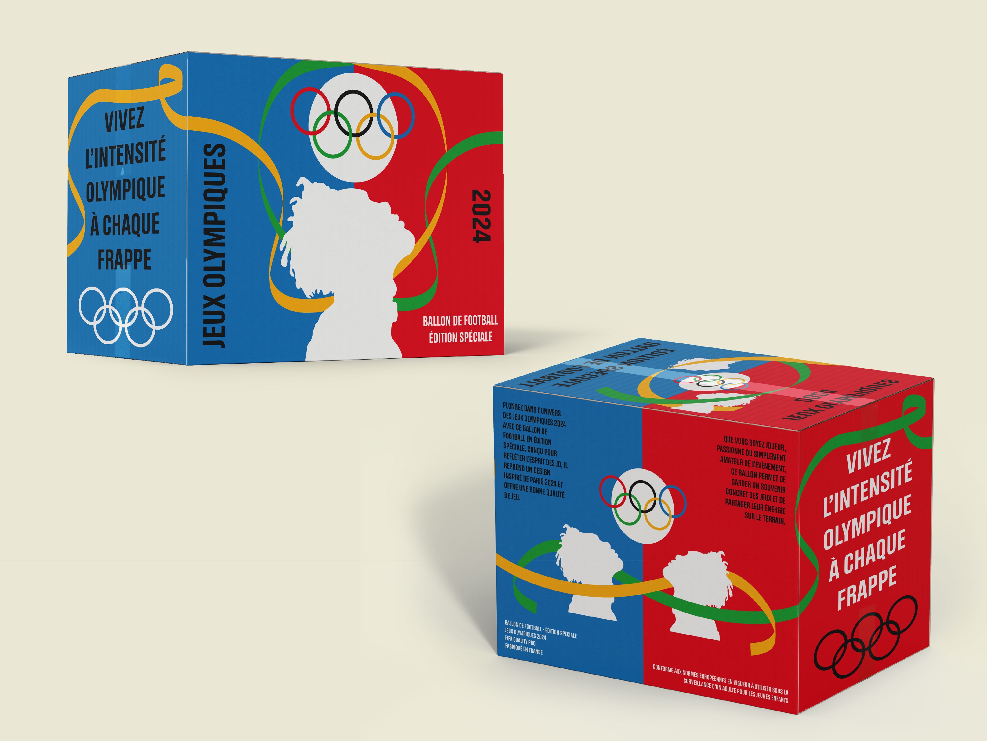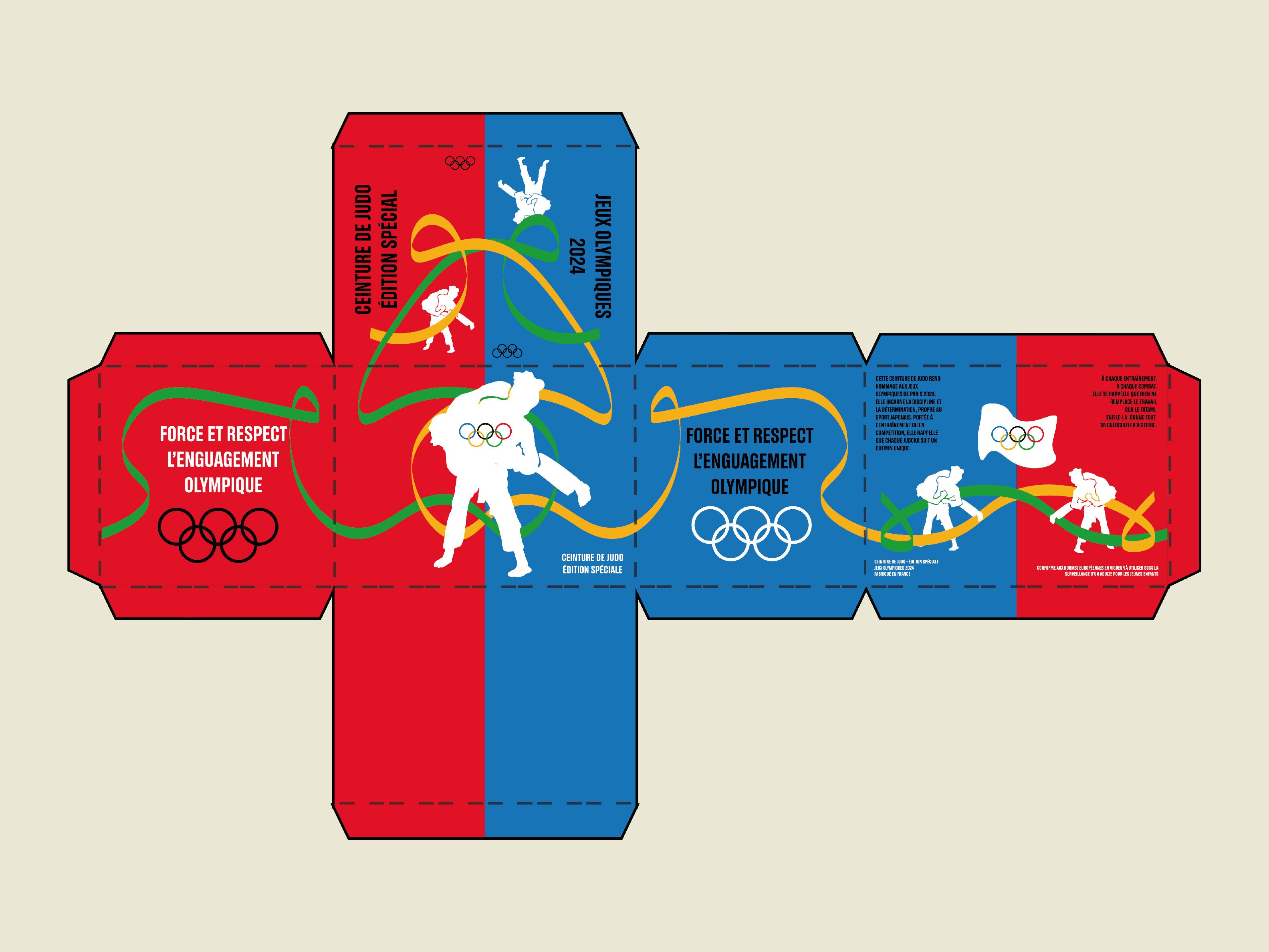 Concept : Création de deux packaging pour la fédération des jeux olympiques sur le thème du sport (foot, judo). L’évènement sont les jeux olypiques de Paris 2024.Il faut respecter la charte graphique existante.